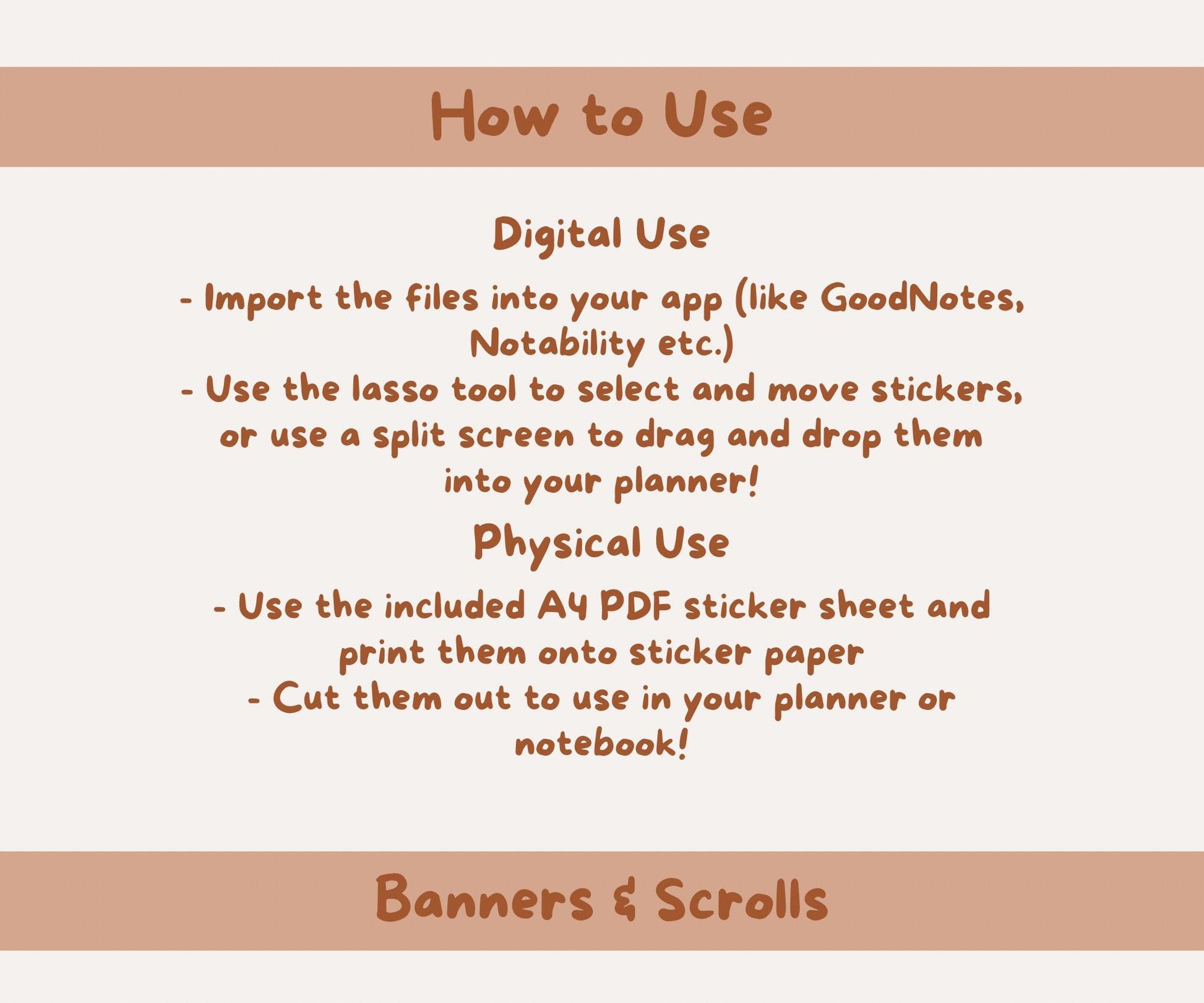 This bundle includes 8 unique banner/scroll designs in 13 colour palettes, each saved as individually cropped, transparent PNGs and a hyperlinked GoodNotes file for digital use plus a printable PNG sticker sheet per colour, making it perfect for both digital and printable planning styles.