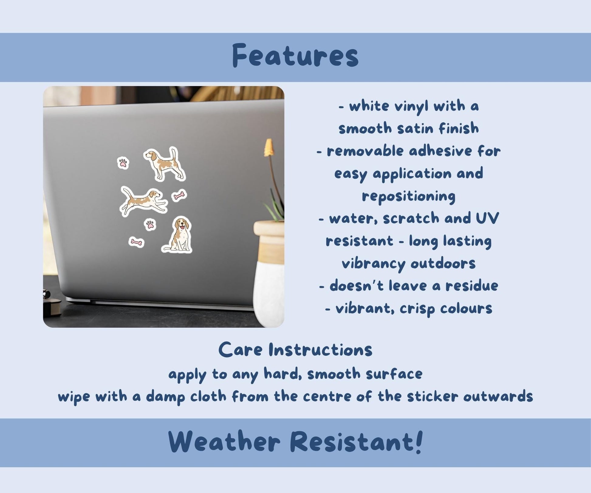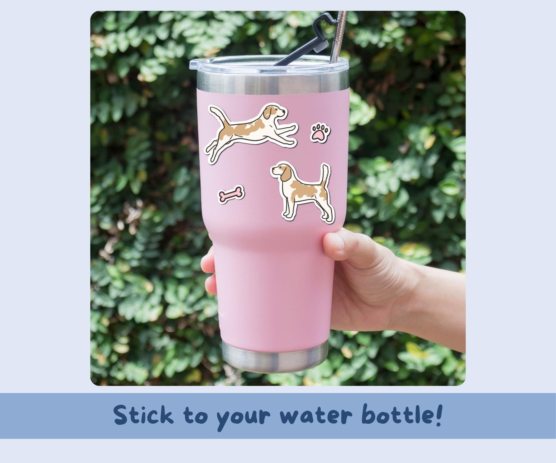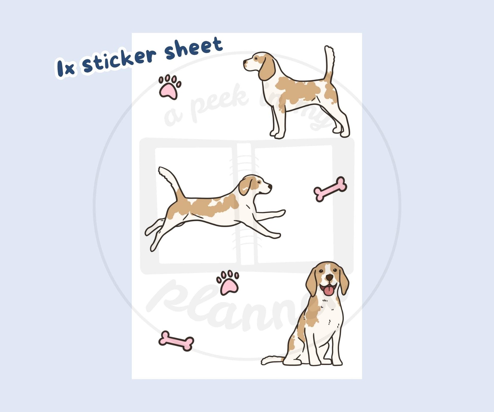 Hand illustrated (no AI) lemon & white Beagles with paw prints & bones vinyl sticker sheet.
