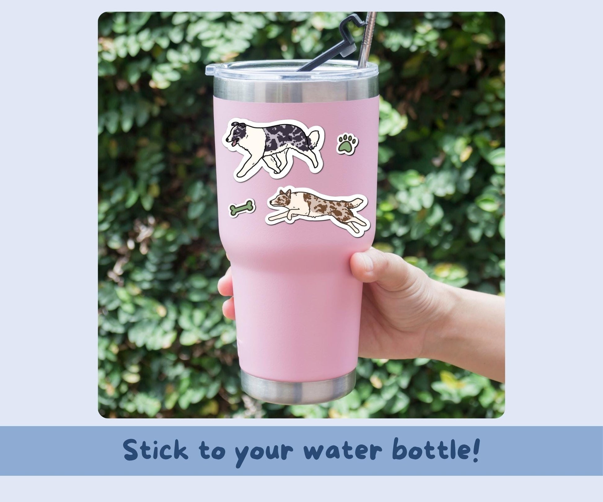 Hand illustrated (no AI) Border Collies with paw prints & bones vinyl sticker sheet.