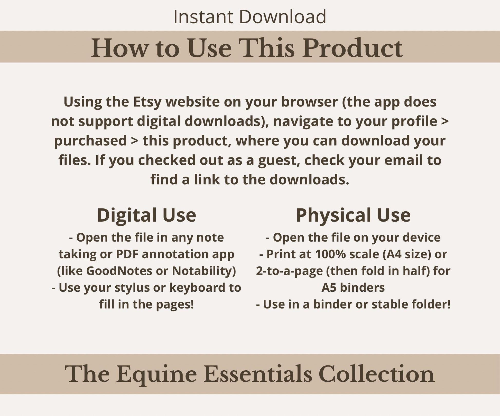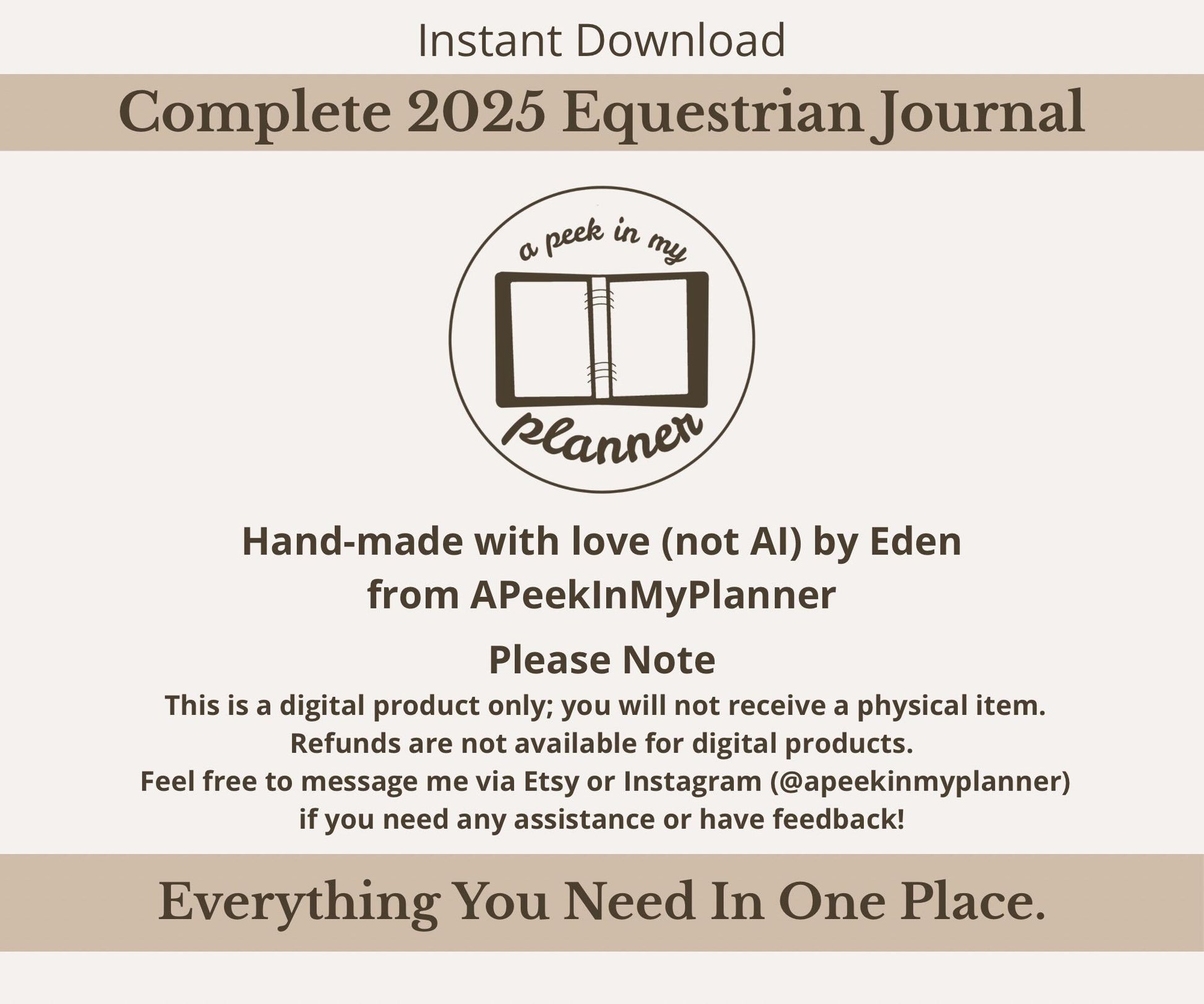 A combination of my horse care & horse training planners, this Complete 2025 Equestrian Journal has it ALL! The Complete 2025 Equestrian Journal was lovingly and thoughtfully hand made with absolutely zero AI influence - all 145 pages! Each and every page was created with productivity and ease of use in mind, resulting in a functional yet simple design.