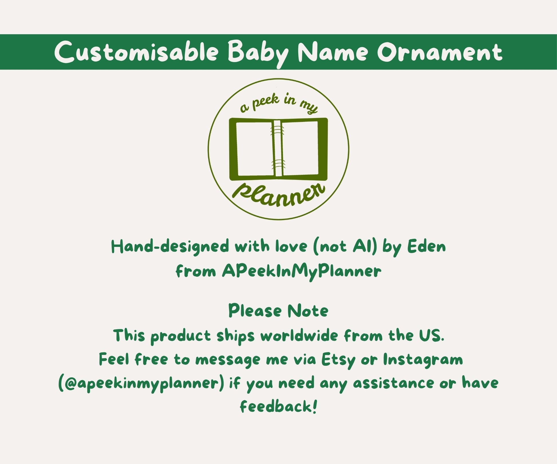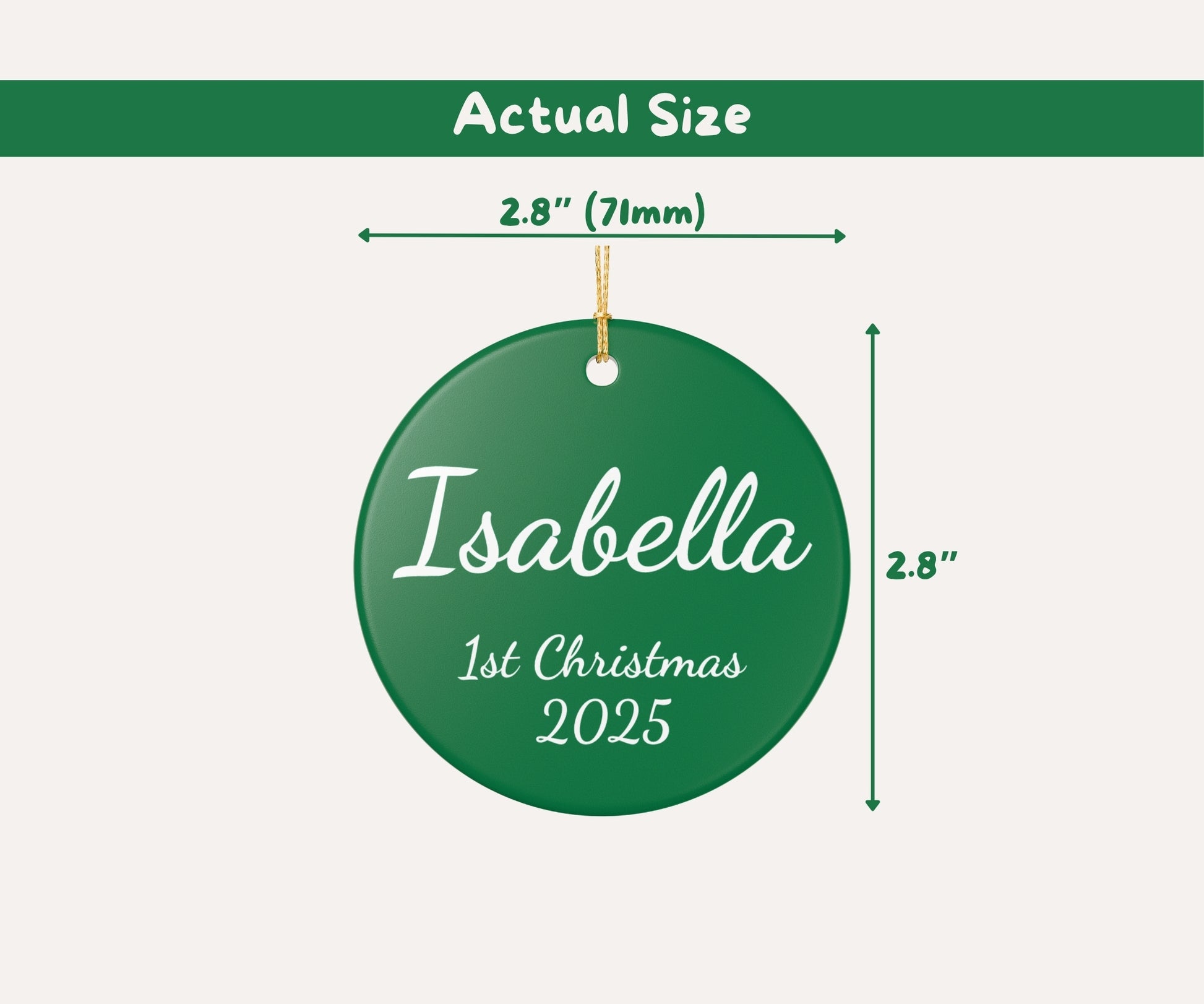 Handcrafted ceramic ornament that captures a sentimental moment on your tree. This lightweight, glossy disc wears a matte-print name and year with a festive green background and hangs from a slim golden string.
