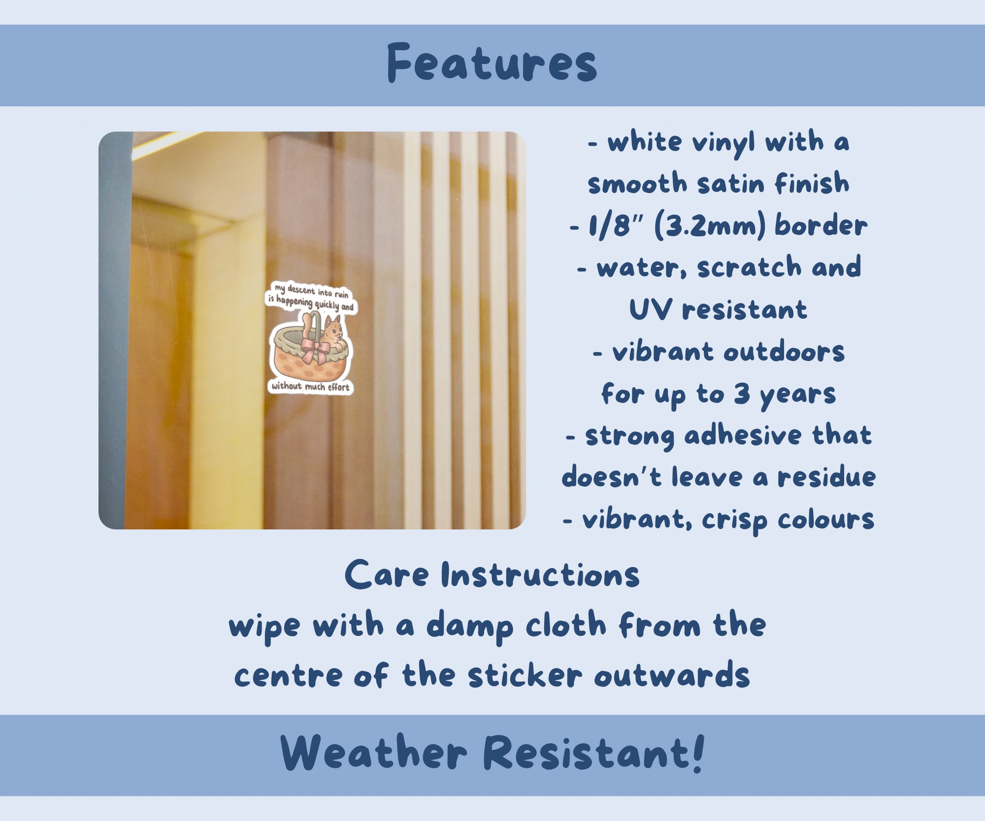 - Use a soft, clean and damp cloth to gently wipe any dust or dirt off from the centre of the sticker outwards.