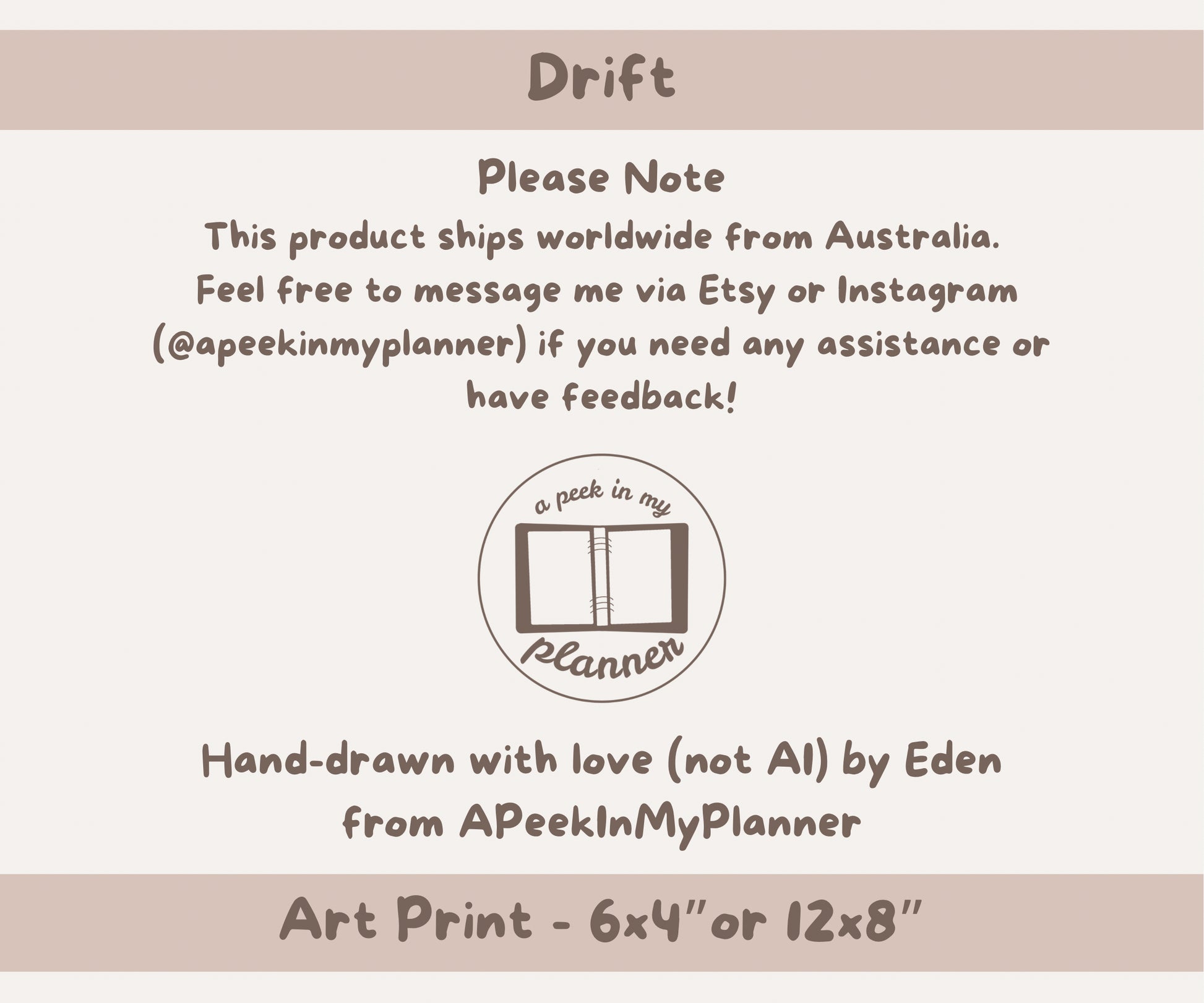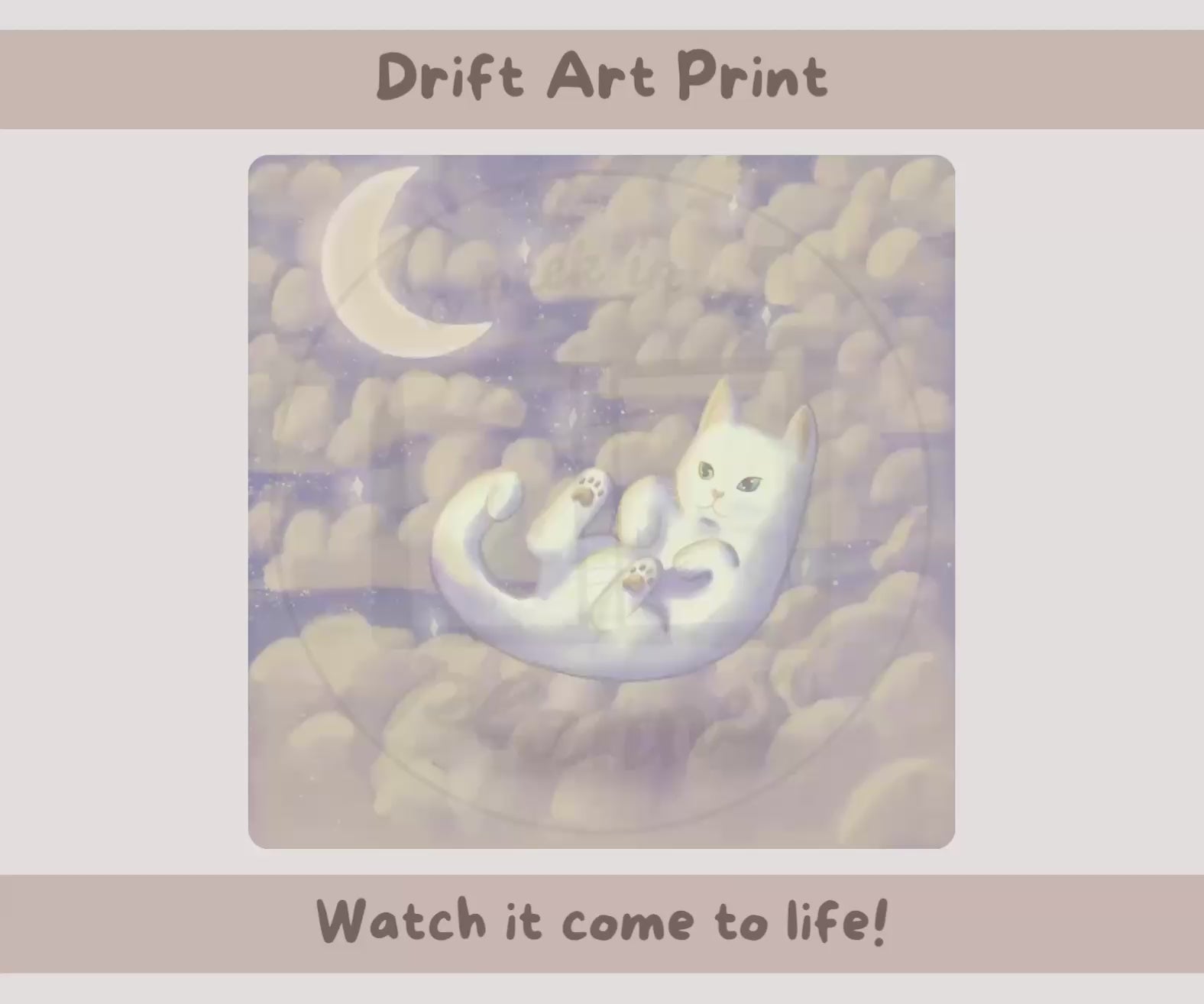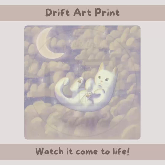 Lose yourself in a peaceful sky with Drift. This dreamy design, featuring a playful white cat among fluffy clouds, instills a sense of peace and serenity, perfect for any room. Ideal for cat lovers, art enthusiasts, or anyone looking to brighten their decor.