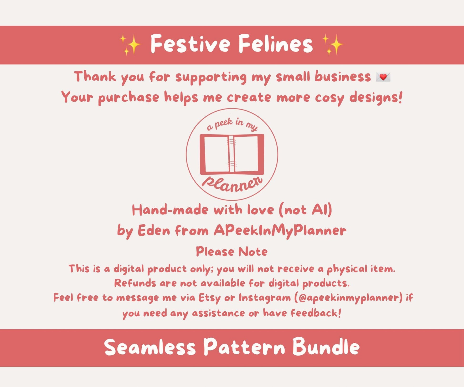 - ownership of the pattern and all of its elements remains with APeekInMyPlanner and we reserve the right to reuse the design and/or its elements