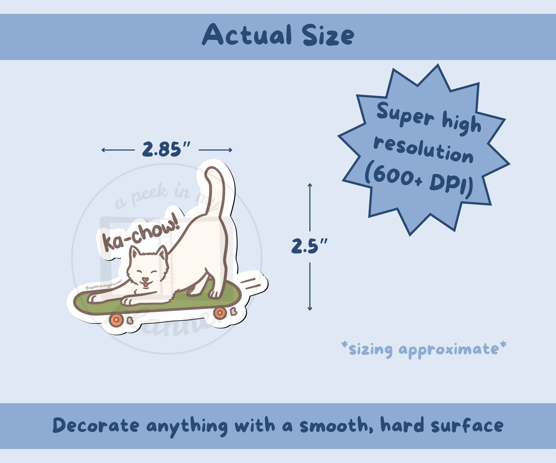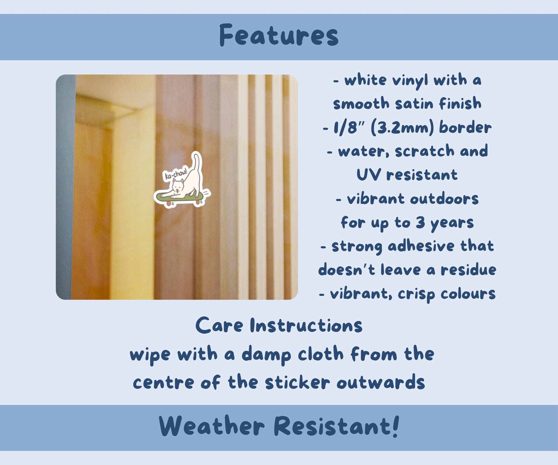 This tiny white kitten on a green skateboard has absolutely no idea what it’s doing—but it’s doing it with confidence. Equal parts silly, feral, and iconic, this sticker is perfect for anyone skating through life powered by vibes and adrenaline.