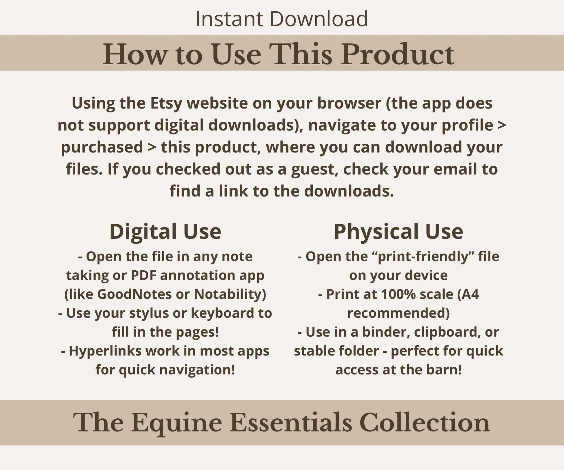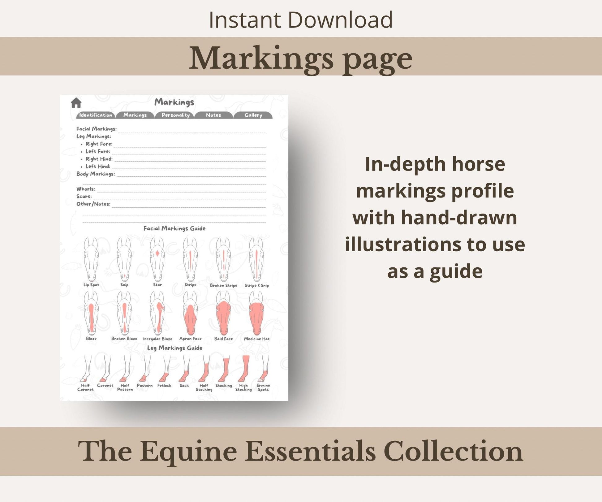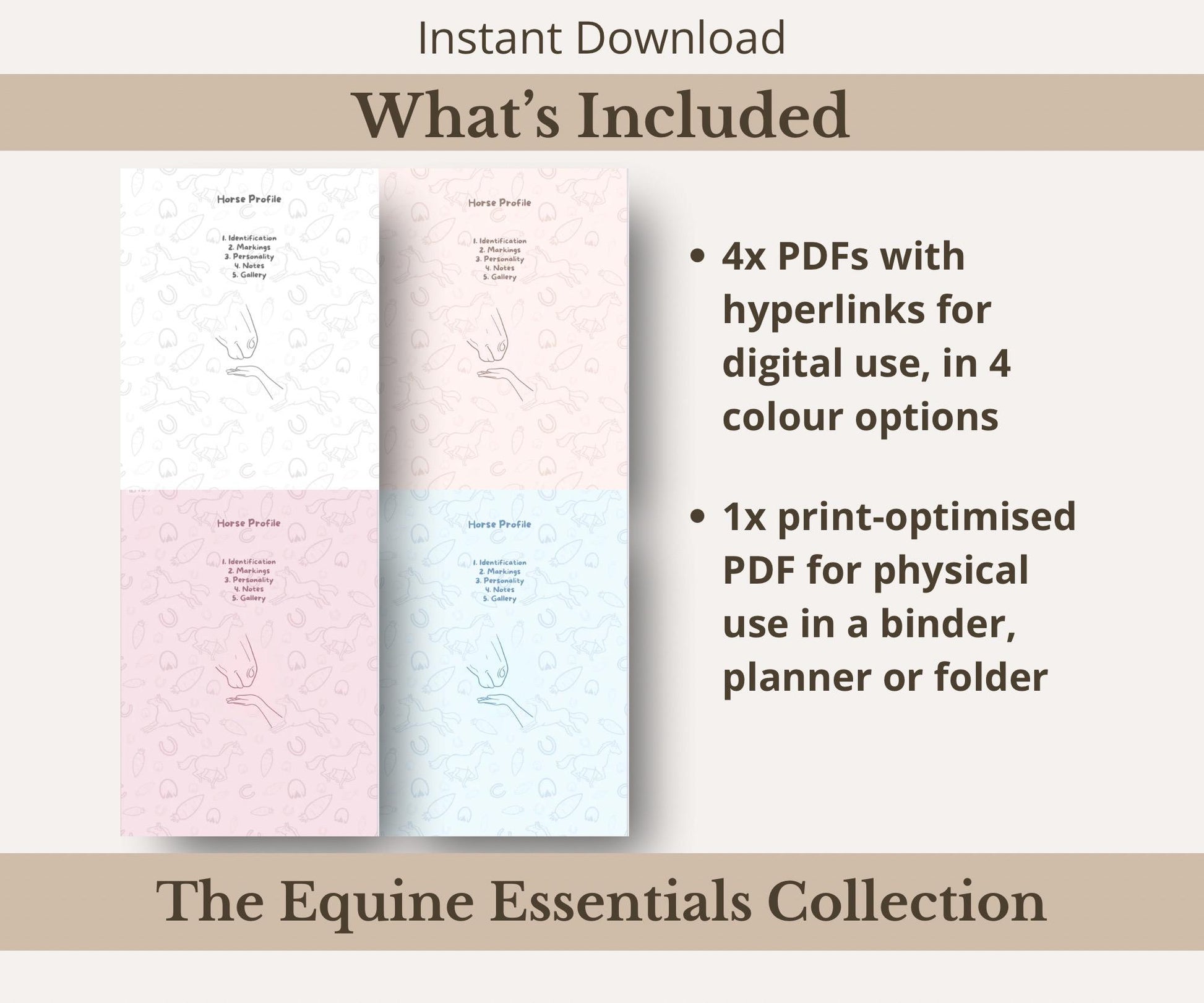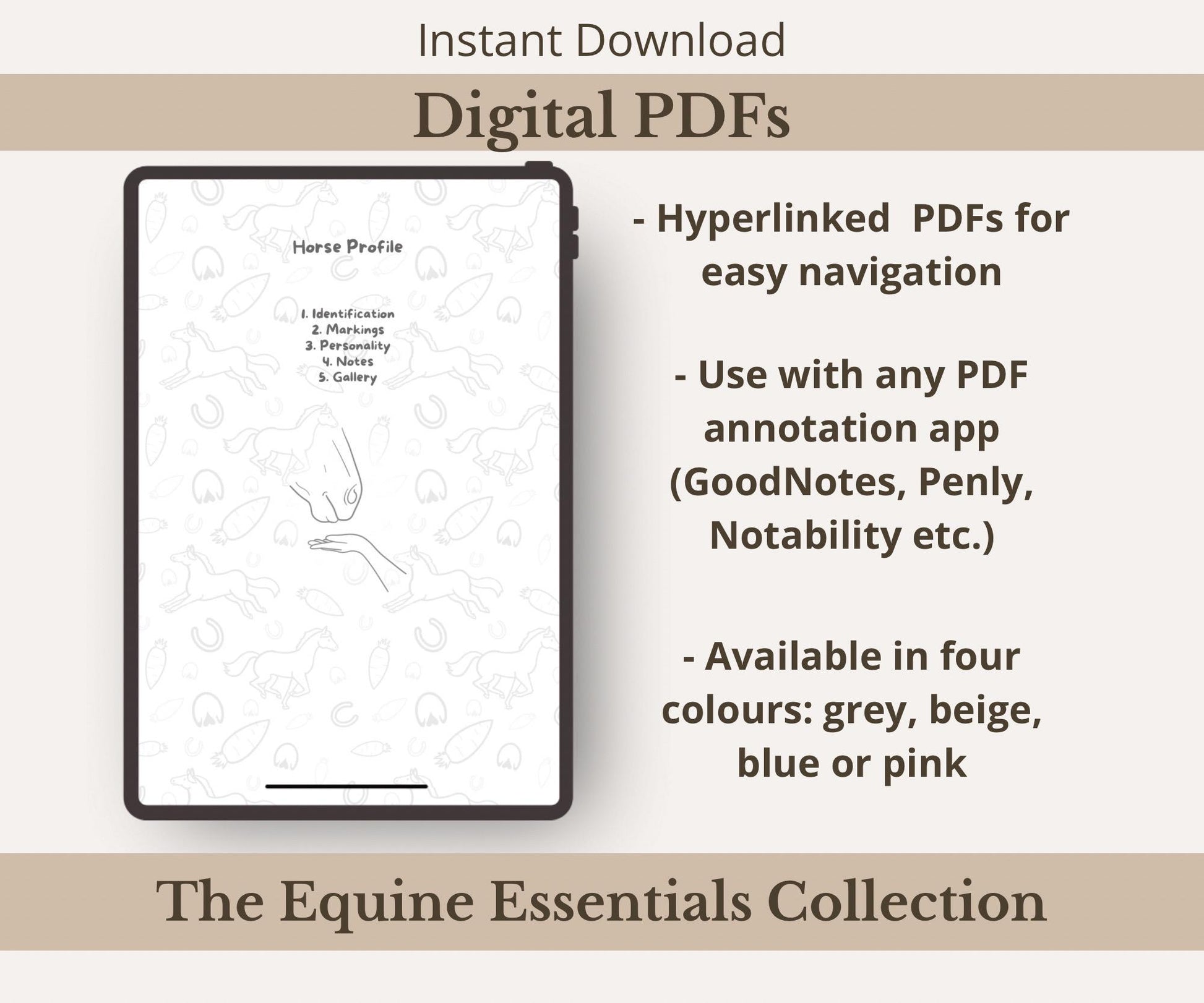 This bundle includes fully hyperlinked digital PDFs (in 4 color options) for easy navigation and a printer-friendly greyscale version with page numbers. Designed with love and illustrated by me, it features everything you need to capture your horse's identity, appearance, and personality.