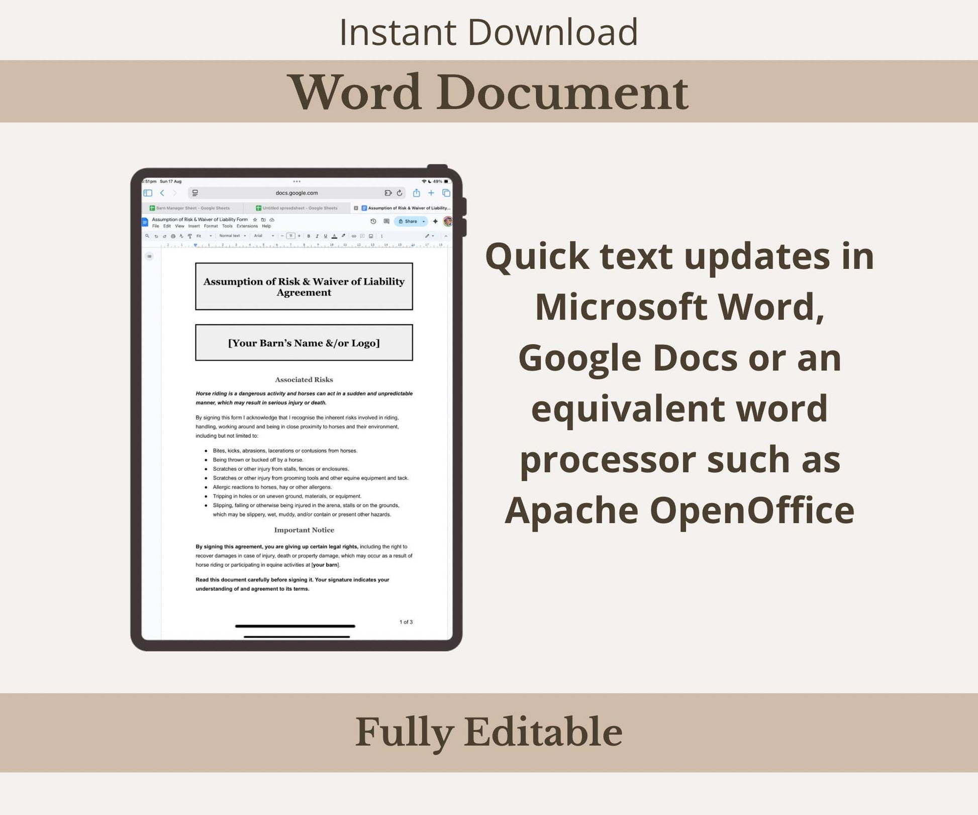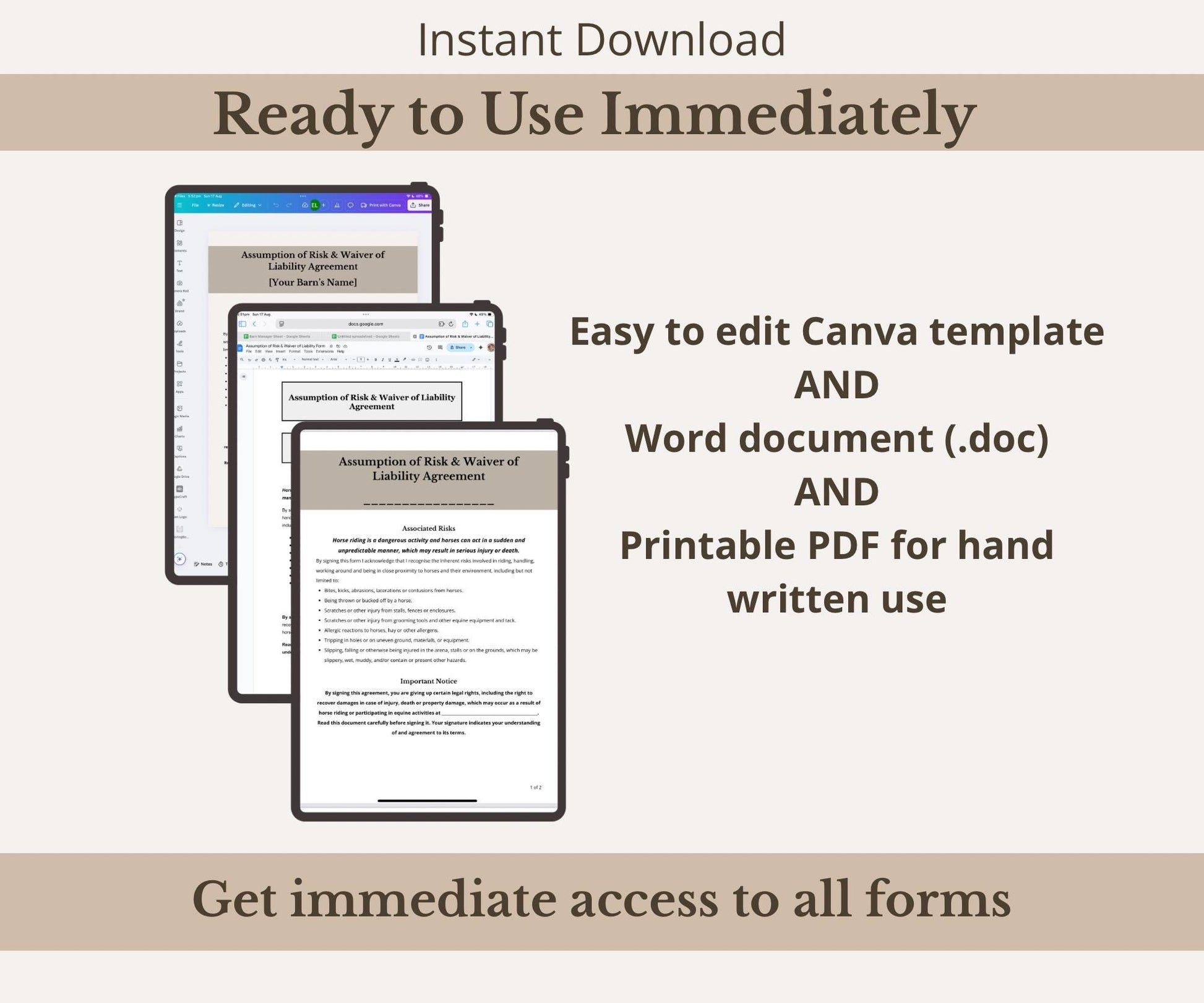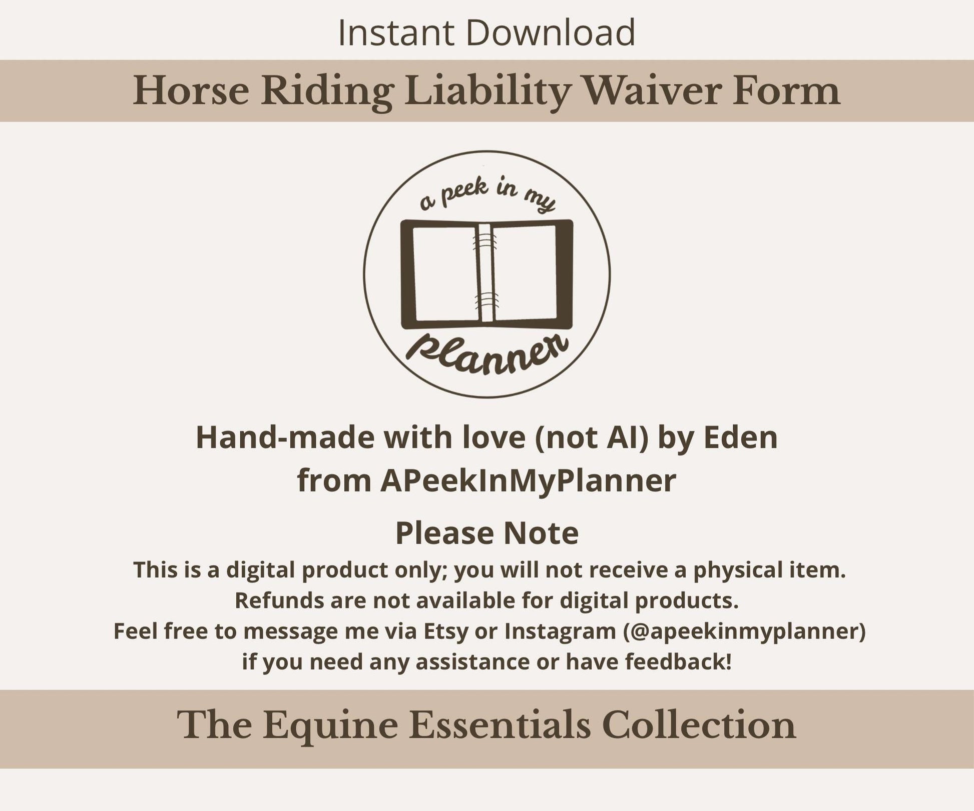 Professionally structured and easy to use, this waiver is ideal for instructors, barns, boarding facilities, and private owners who want clear documentation of risk and responsibility.