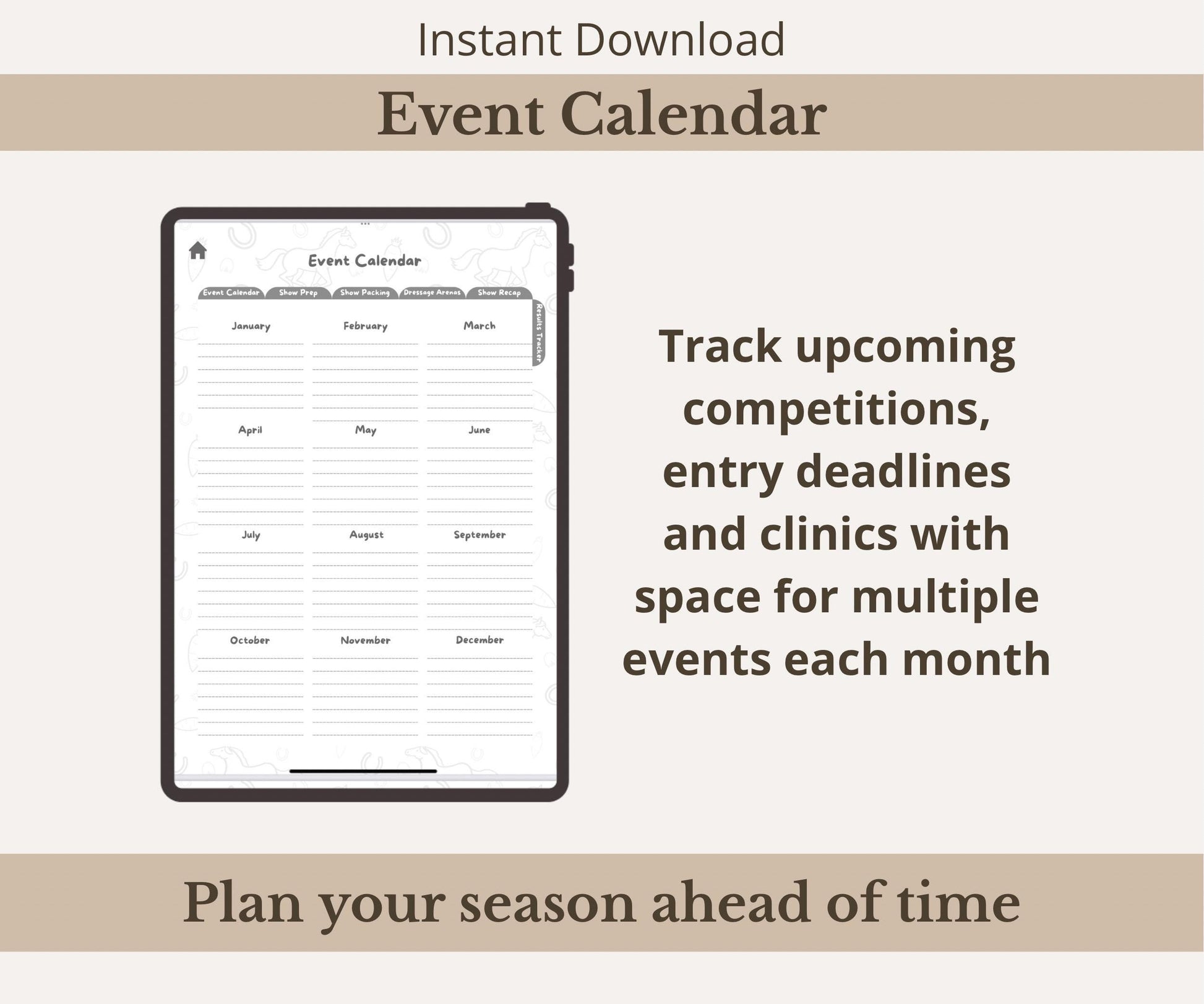 - Events Calendar: 12-month calendar with space for multiple events per month