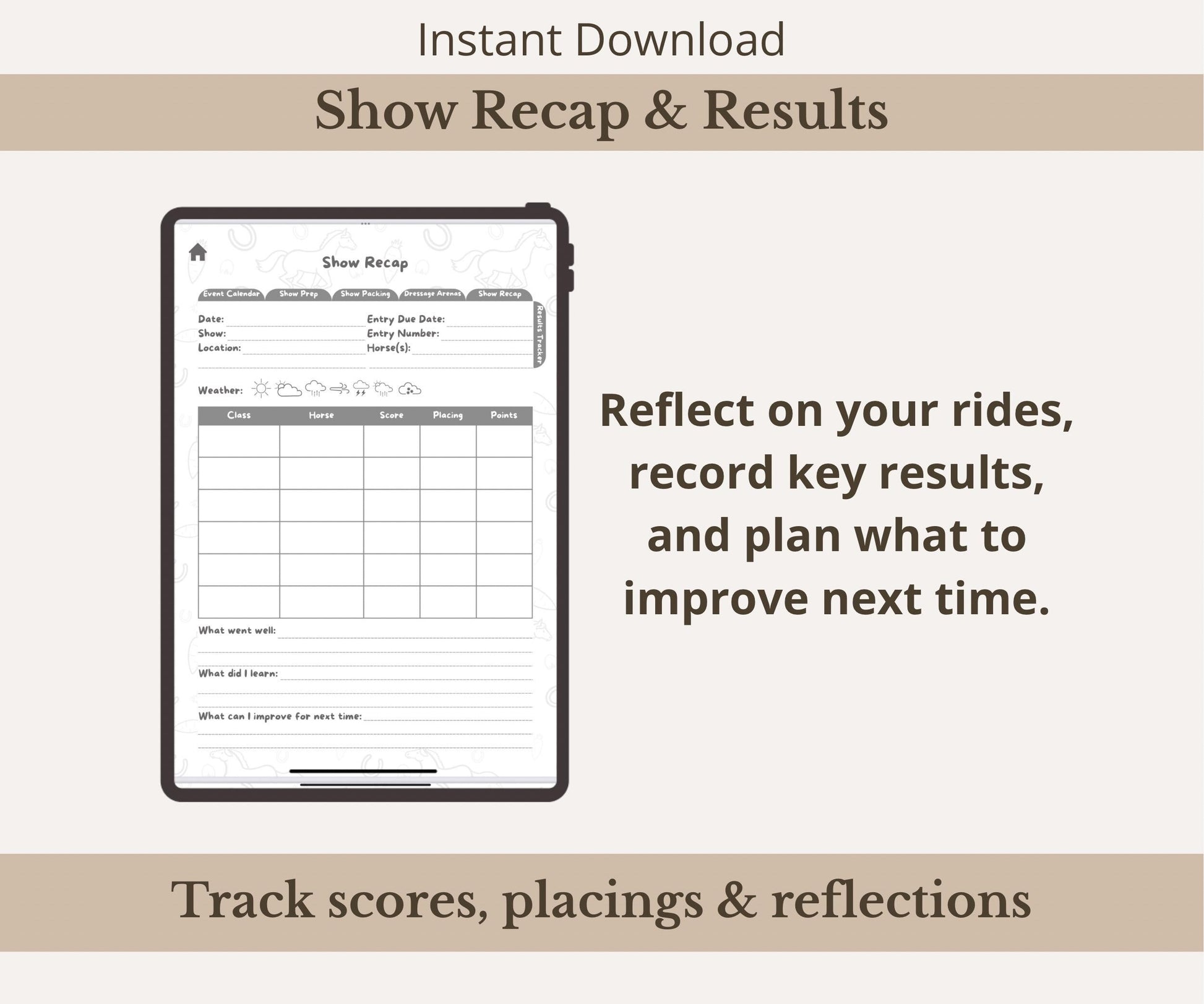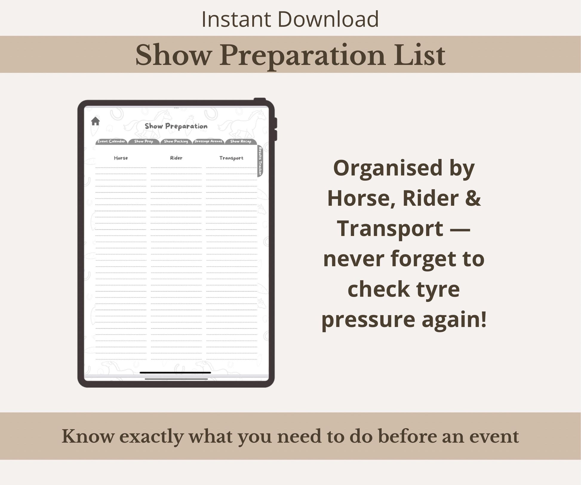 Designed to help equestrians stay organised, prepared, and reflective all through the show season, from planning & packing to post-show analysis & results tracking.
