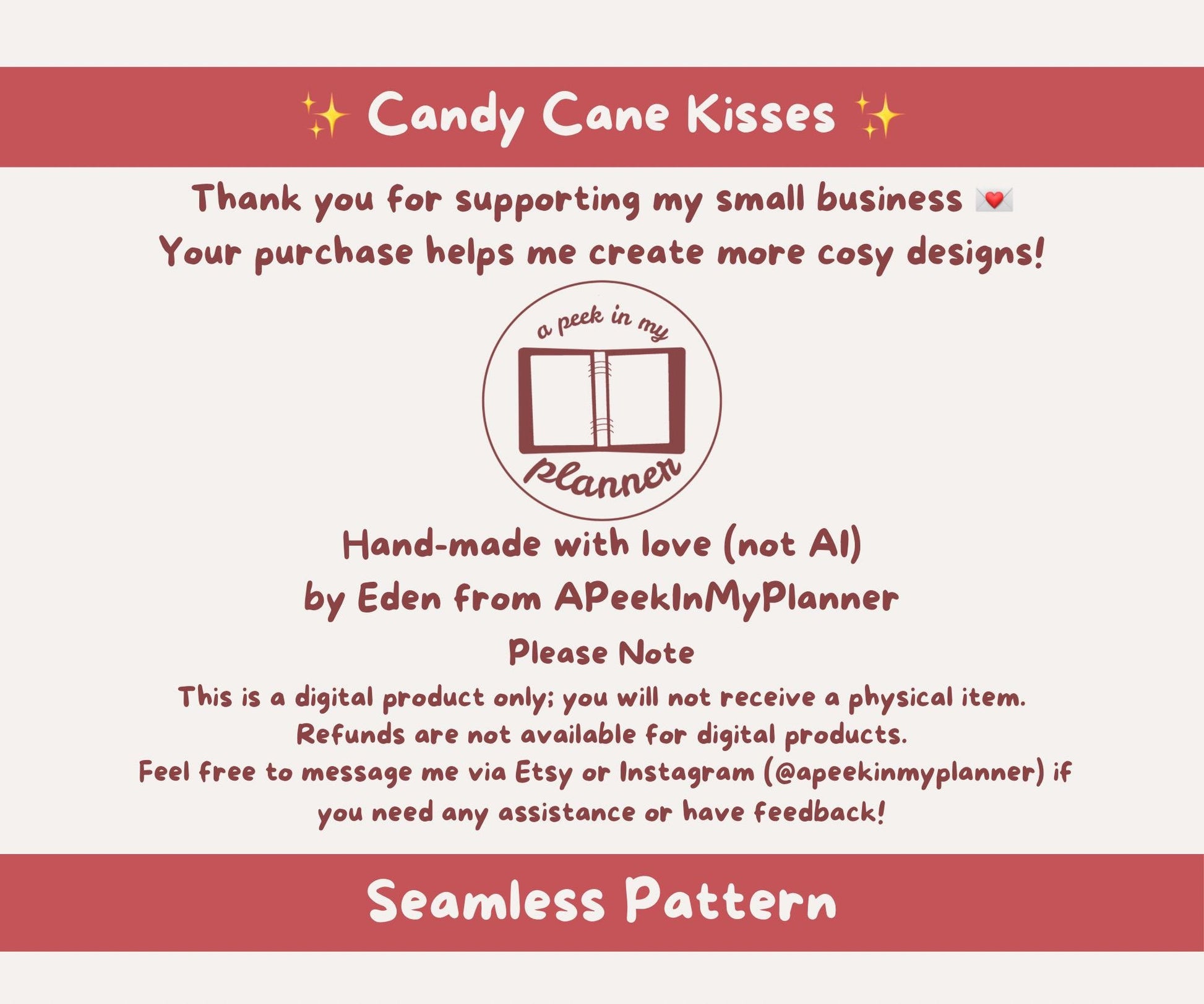 - ownership of the pattern and all of its elements remains with APeekInMyPlanner and we reserve the right to reuse the design and/or its elements