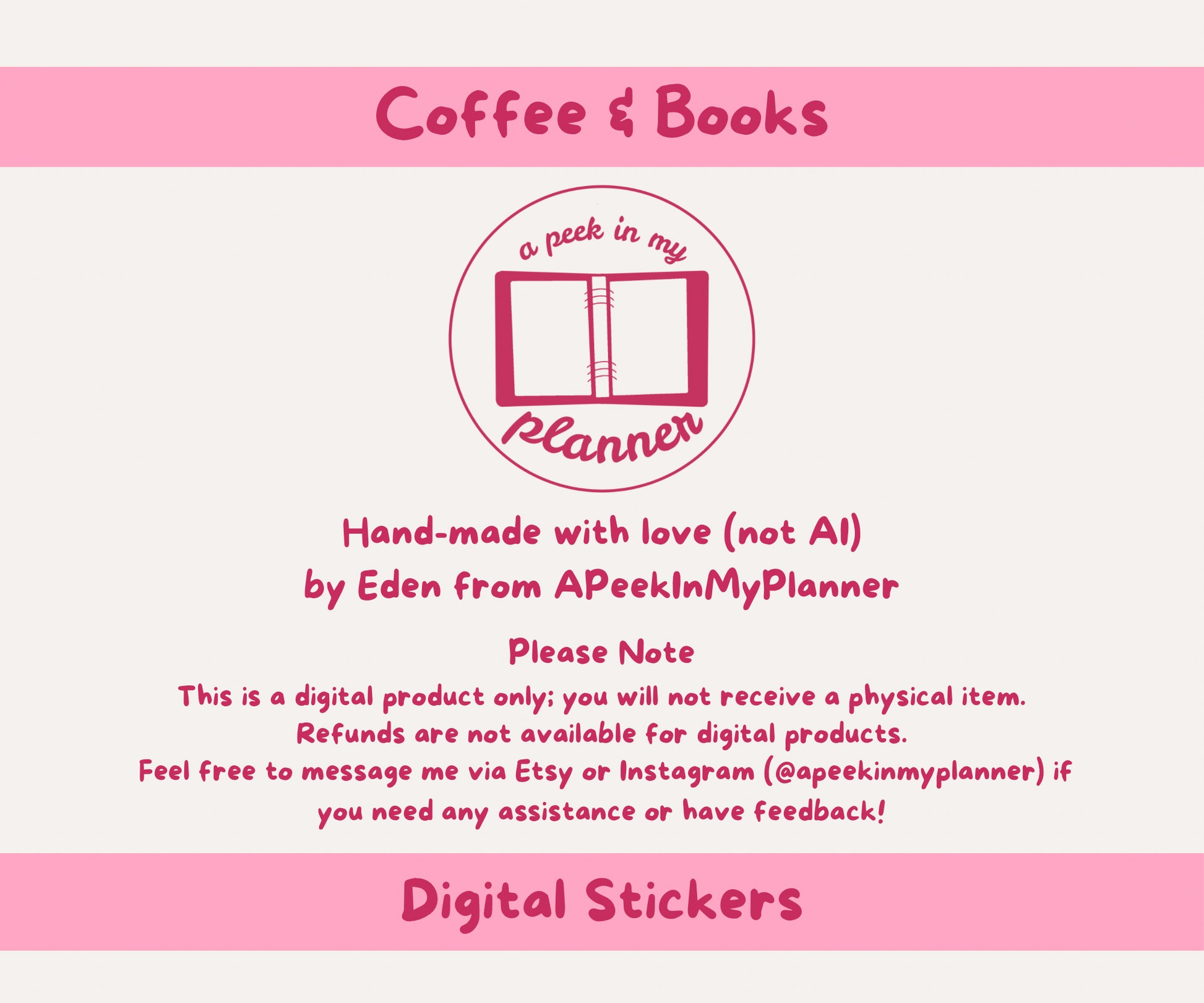 Add cozy charm to your digital or physical planner with this pink aesthetic bookish & coffee-themed digital sticker set. Designed for lovers of reading, journaling, and warm café vibes, this 15-piece sticker collection is perfect for decorating your GoodNotes planners, digital journals, bullet journals, or printed notebooks. With soft pink tones, books and coffee cups, this set brings all the warm book-lover energy you need.