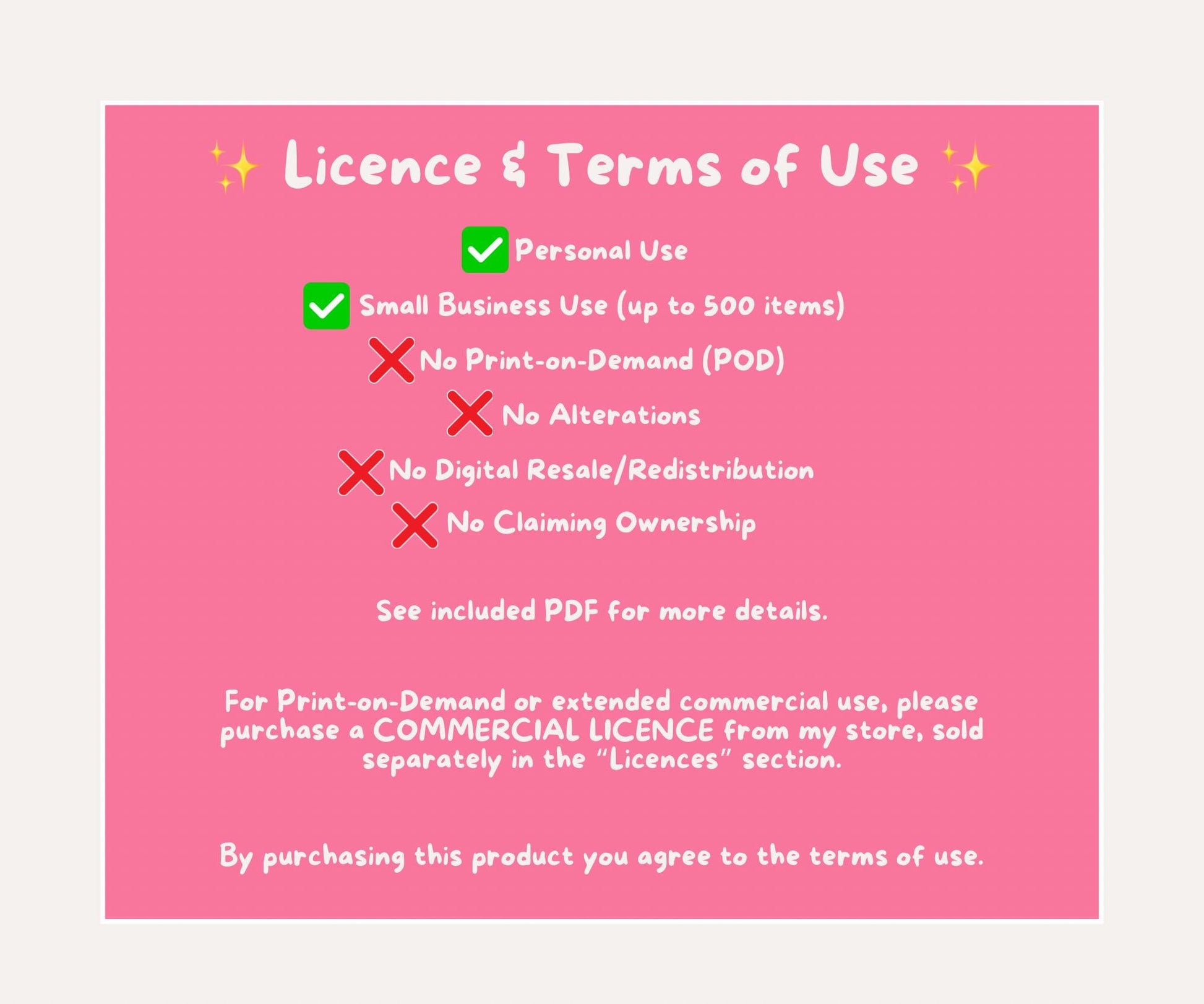 - No Print-on-Demand (POD): you may not upload this pattern to print-on-demand sites including but not limited to Teepublic, RedBubble, Zazzle, Printify, Printful - PLEASE BUY A POD LICENCE