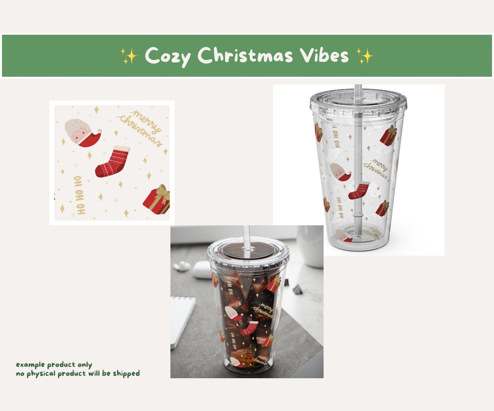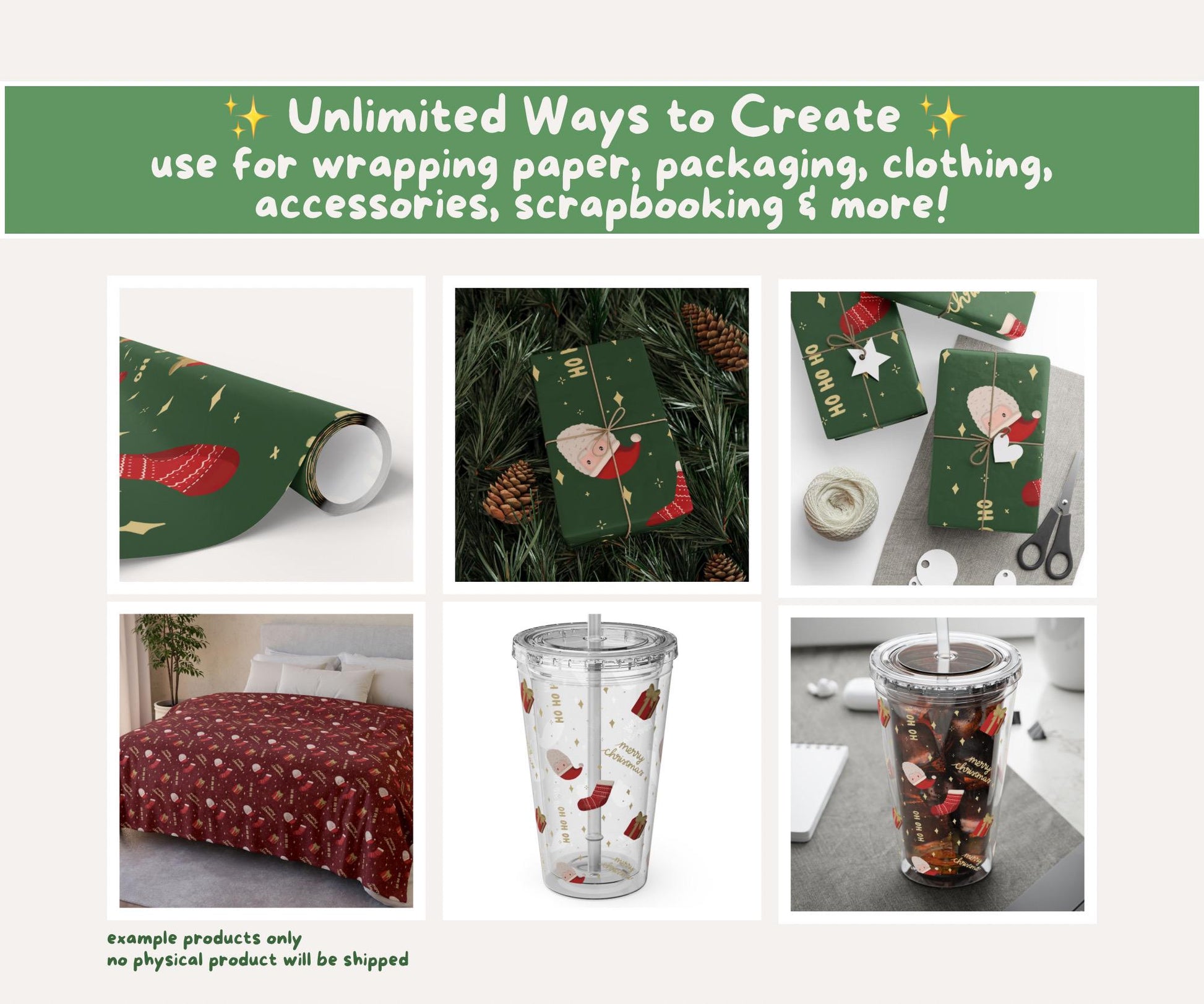 ✨ A cheerful pattern bursting with North Pole magic: Santa, stockings, and gifts galore for playful holiday projects. In three colourways: Holly Green, Vintage Cream, & Poinsettia Red, PLUS transparent.