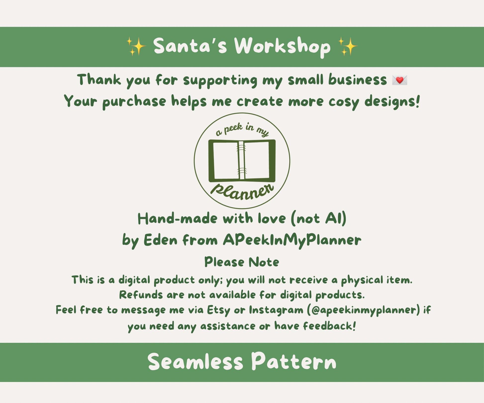 - ownership of the pattern and all of its elements remains with APeekInMyPlanner and we reserve the right to reuse the design and/or its elements