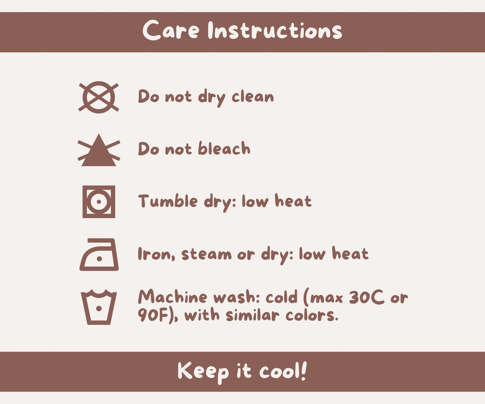 Care instructions: Machine wash: cold (max 30C or 90F), with similar colors , Do not bleach, Tumble dry: low heat, Iron, steam or dry: low heat, Do not dryclean