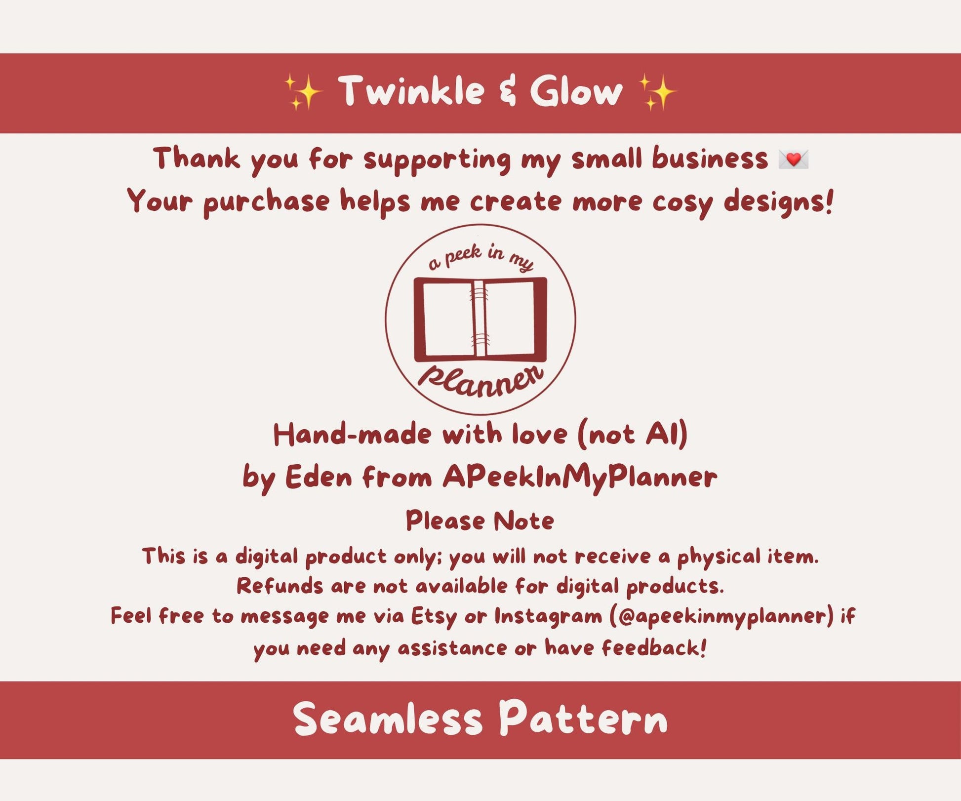 - ownership of the pattern and all of its elements remains with APeekInMyPlanner and we reserve the right to reuse the design and/or its elements