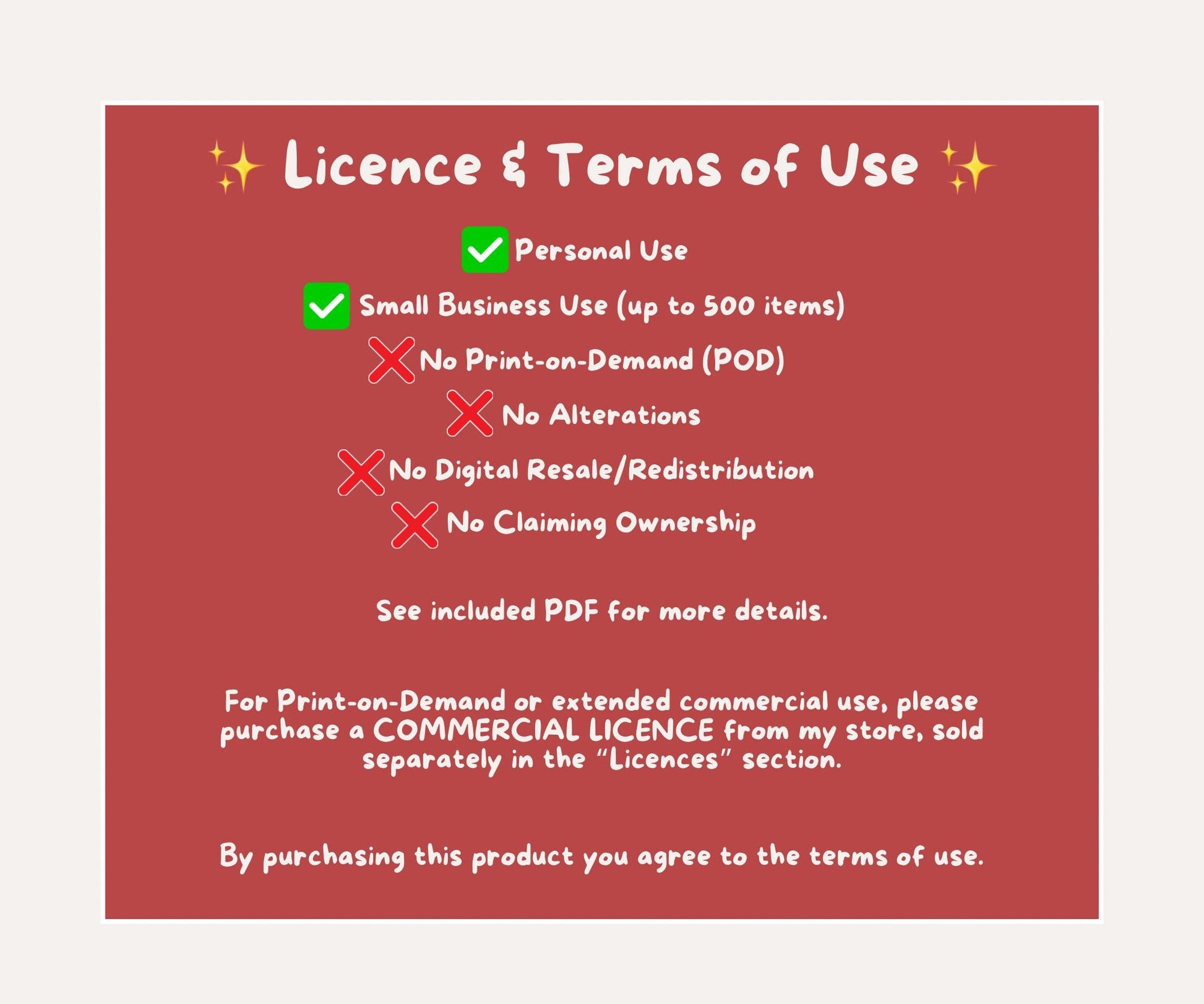 - No Print-on-Demand (POD): you may not upload this pattern to print-on-demand sites including but not limited to Teepublic, RedBubble, Zazzle, Printify, Printful - PLEASE BUY A POD LICENCE