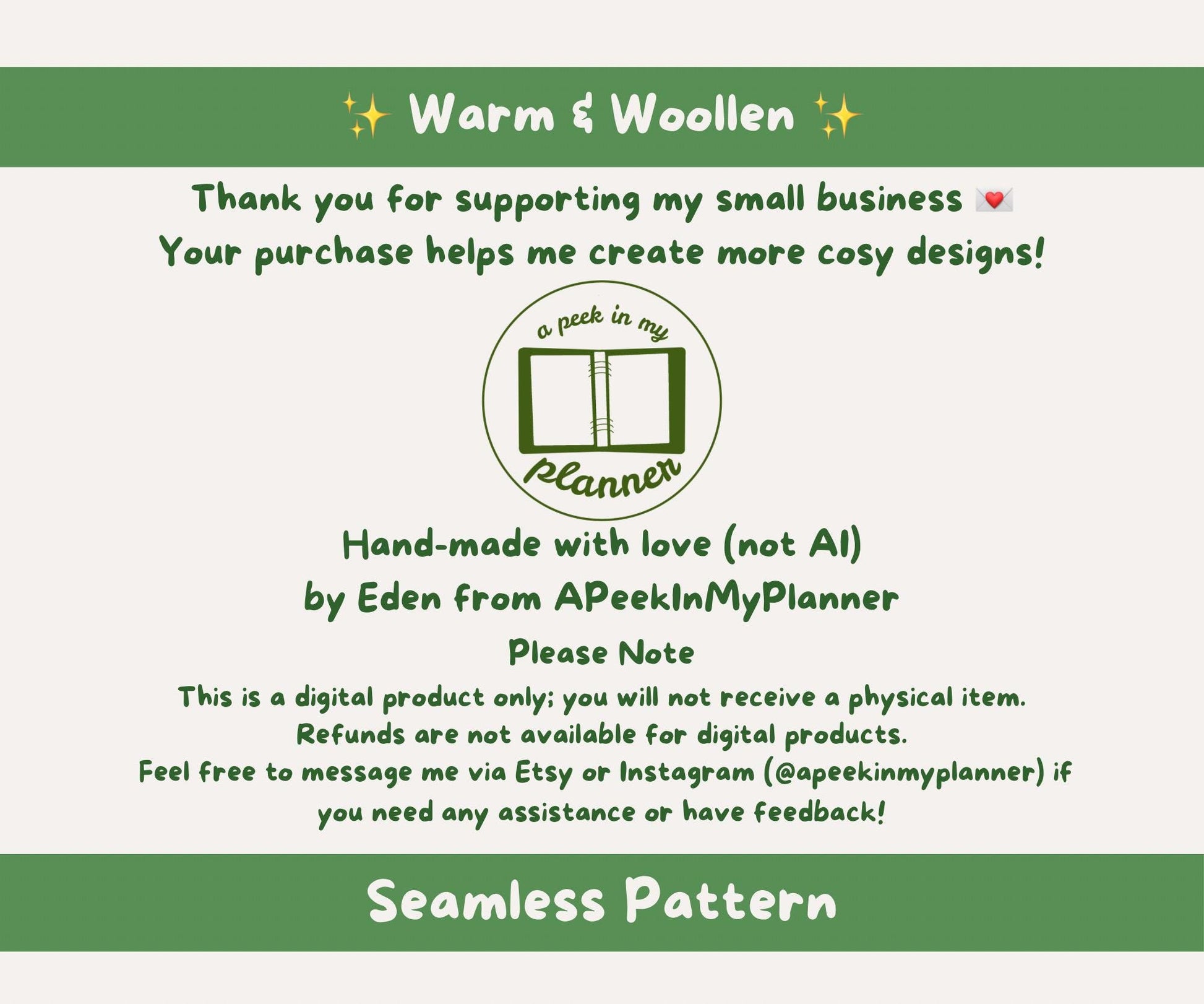 - ownership of the pattern and all of its elements remains with APeekInMyPlanner and we reserve the right to reuse the design and/or its elements